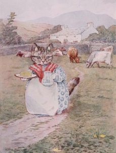 The Pie and the Patty-pan. London, New York, Frederick Warne & Co, 1905. In-12, cartonnage bleu illustré d'un médaillon argenté orné d'un petit portrait de chat, dos lisse (Cartonnage de l'éditeur). Édition originale anglaise illustrée de 10 planches hors texte en couleurs et de vignettes en noir de Beatrix Potter.