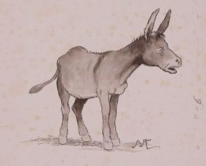 L'Âne. Dessin original. [Vers 1900]. Encre de Chine sur papier, 36,5 x 26 cm. Un dessin d'âne et une vignette à l'encre de Benjamin Rabier.