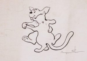 RABIER (Benjamin). Un chien dansant avec un chat. Dessin original. S.d. Encre de Chine sur papier fort, 10 x 13 cm. …