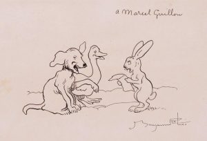RABIER (Benjamin). Le Chien, la cane et le lapin. Dessin original à Marcel Guillon. S.d. Encre de Chine, 13 x 17 cm. …