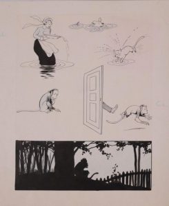 Dessins préparatoires. S.d. Une planche, encre de Chine et rehauts de crayon de couleur bleu, 31,4 x 27,3 cm. Six petits dessins préparatoires à l'encre et en bleu représentant une femme de chambre, un chien nageant, un chat sautant dans une flaque, un singe, un singe mis dehors et une vignette en ombre-chinoise d'un singe sous un arbre.