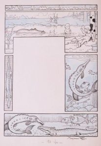 FLORIAN. Le Crocodile et l'Esturgeon. Dessin original. S.d. Encre de Chine sur papier fort, 33 x 23 cm. Dessin à l'encre noire rehaussé d'aquarelle bleue de Benjamin Rabier encadrant un espace vide destiné au texte imprimé.
