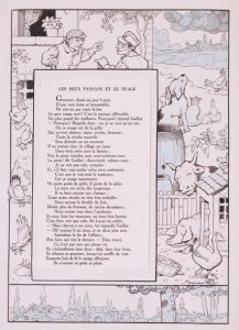FLORIAN. Les Deux paysans et le nuage. Dessin original. S.d. Encre de Chine sur papier fort, 33 x 23 cm. Dessin à l'encre noire rehaussé d'aquarelle bleue de Benjamin Rabier encadrant la fable de Florian, laquelle est imprimée et contrecollée au centre de la planche.