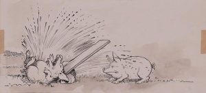 Jimmy. 2 cochons passant sur une planche posée sur un rondin. Dessins originaux. N°28. S.d. 2 dessins préparatoires appliqués sur papier fort, encre de Chine et aquarelle, dimensions diverses, format final 32,5 x 25 cm. Cachet des Éditions Garnier au verso avec la mention manuscrite «Jimmy».