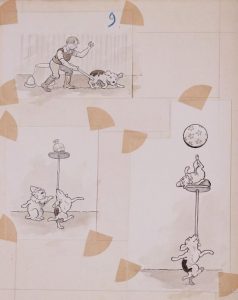 RABIER (Benjamin). Jimmy. Chiens acrobates. Dessin original. Planche n°9. S.d. 3 dessins préparatoires appliqués …