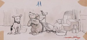 Jimmy. Dessin original. Planche n°11. S.d. 3 dessins préparatoires appliqués sur papier fort, encre de Chine et aquarelle, dimensions diverses, format final 32,5 x 25 cm. Dessins représentant un ourson enchaîné au cou, entouré d'un chien, d'un pélican et d'un autre oiseau, le chien libérant l'ourson et enfin le chien et l'ourson s'enfuyant dans la nuit.