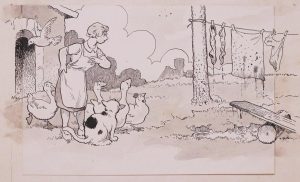 Jimmy. Une fermière entourée d'animaux de basse-cour regardant du linge pendre et une planche posée sur un rondin. [Et] Deux chiens, assis, en conversation. Dessins originaux. N°29. S.d. 2 dessins préparatoires appliqués sur papier fort, encre de Chine et aquarelle, dimensions diverses, format final 32,5 x 25 cm. Cachet des Éditions Garnier au verso avec la mention manuscrite «Jimmy».
