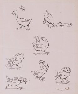 Sept canards et une grenouille. Dessin original. S.d. Encre de Chine sur papier fort, 22 x 18 cm. Dessins d'oie et de grenouille à l'encre noire de Benjamin Rabier.
