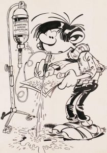 Gaston. Encre de Chine originale, non signée. 43 x 30,5 cm. Gaston écrivant avec un stylo plume relié à une perfusion d'encre noire.