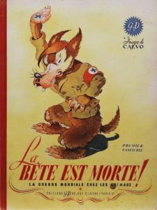 Ensemble 2 ouvrages. Paris, Éditions G.P., s.d. [1944-1945]. 2 volumes in-4, cartonnages illustrés de l'éditeur. Deux rares albums écrits par Victor Dancette et illustrés par Edmond-François Calvo racontant sous forme de satire la Seconde Guerre mondiale et l'Occupation. Les héros y sont dessinés en animaux personnifiés (entre autres, les Allemands en loups, les Anglais en chiens, les Français en lapins ou grenouilles...).