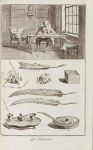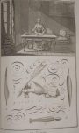 L'ILLUSTRATION COMPREND 3129 PLANCHES GRAVÉES EN TAILLE-DOUCE, remarquables par leur intérêt documentaire est fort jolies pour la plupart. On y voit quelques-unes des premières représentations d'industries, des artisanats et des commerces. Certaines gravures montrent les intérieurs des boutiques ou des ateliers, d'autres les outils et les instruments des professions. La collection comprend bien le frontispice de Cochin, paru tardivement que Diderot décrit avec enthousiasme dans le Salon de 1763. Il est ici en premier état avant l'adjonction de la presse à imprimer.