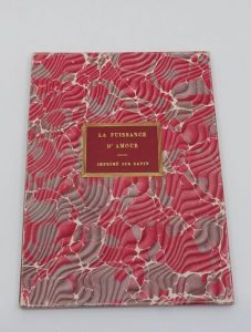 IMPRESSION DU XVIIE SIÈCLE SUR SATIN bLANC. La Puissance d'Amour. Sans lieu ni date, France, XVIIe siècle (?) ; plaquette in-4 (253 x 133 mm) de [8] ff. de satin imprimés d'un seul côté le dernier blanc (A-D2), broché, sous chemise à dos de maroquin rouge, étui avec pièce de titre de maroquin rouge sur le plat supérieur.
