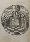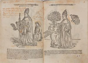 Grande vignette à fond noir sur la page de titre et 32 FIGURES À PLEINE PAGE GRAVÉES SUR BOIS : maître lisant à une tribune entouré de quatre personnages, 22 portraits de papes chargés d'attributs étranges et dans des attitudes statiques ou théâtrales, monstres et figurations ésotériques diverses.