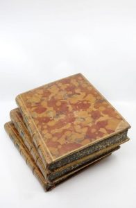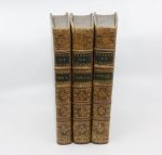 MONTAIGNE Michel de. Les Essais. Nouvelle édition faite sur les plus anciennes et les plus correctes augmentée de quelques lettres de l'auteur ; & où les passages grecs, latins & italiens sont traduits plus fidèlement & cités plus exactement que dans aucune des éditions précédentes. Londres, de l'Imprimerie de J. Tonson et J. Watts, 1724 ; 3 vol in-4, reliures de l'époque veau à marbrures polychromes, filets dorés, dos à nerfs ornés de motifs dorés, pièces noires, dentelle intérieure dorée.