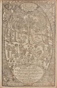 bois par Christopher Switzer (quelques piqûres), d'un portrait de l'auteur et de 110 PLANCHES DE PLANTES ET DE FLEURS OFFRANT 832 SUJETS, le tout gravé sur bois. Peu de livres de fleurs ont suscité autant d'admiration que le Paradisi, tant pour son charme que pour son « style littéraire, si agréable et si chaleureux, que les amateurs de jardins l'affectionnent toujours en notre temps » (Hunt). Le titre est un calambour en lien avec le nom de l'auteur : Paradisi in sole (« Park in sun »).