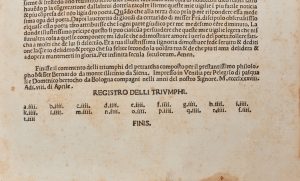 que Brunet qui ne se trompe jamais la croit illustrée et la confond avec une autre. Si l'on considère que les Trionfi et les Canzoniere (qui se complètent) doivent être réunis, seulement deux des sept exemplaires conservés aux États-Unis sont complets.