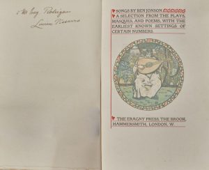 premier feuillet et d'initiales ornementées tirées en rouge. Musique notée. Grande marque de l'Eragny Press à la fin. Tirage