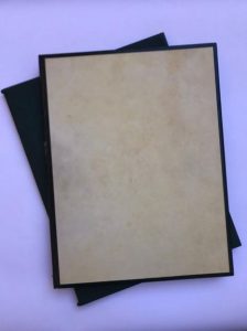 d'un grand rectangle de peau de vélin, dos lisse, titre en long, tête dorée, couverture et dos, étui, petite égratignure à un mors