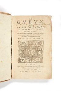 Le Gueux, ou la vie de Guzman d'Alfarache, image de la vie humaine. En laquelle toutes les fourbes, & toutes les méchancetez qui se pratiquent dans le monde, sont plaisamment & vilement descouvertes. Divisé en trois livres. Paris, Pierre Billaine, 1627.