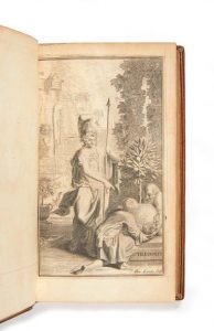 In-12 (163 x 93 mm) d'un frontispice gravé de Pierre Landry, 5 ff.n.ch., 298 pp., 8 ff.n.ch. de table; 9 ff.n.ch., pp. [17]- 189 pp., 4 ff.n.ch.; maroquin rouge, triple filet doré d'encadrement, dos à nerfs, caissons ornés aux petits fers, roulette du dauphin en queue, doublure de maroquin rouge sertie d'une roulette, tranches dorées (reliure attribuée à Luc-Antoine Boyet).