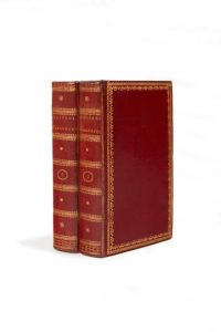2 volumes in-8 (201 x 212 mm) d'un frontispice gravé, 415 pp. (dont le faux-titre et le titre), 7 planches gravées sur cuivre pour le volume I; un frontispice gravé, 2 ff.n.ch., 398 pp., 6 planches gravées pour le volume II; maroquin rouge, double roulette décorative dorée d'encadrement, dos lisse orné, roulette sur les coupes et à l'intérieur, doublure et gardes de soie bleue, tranches dorées (reliure de l'époque).