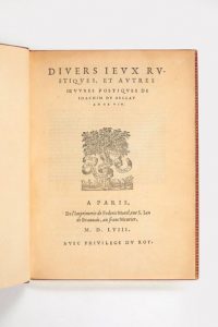 DU BELLAY, Joachim. Divers jeux rustiques, et autres oeuvres poétiques. Paris, Fédéric Morel, 1558. In-4 (210 x 156 …