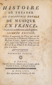 Première édition sous ce titre de ce livre qui fut d'abord publié en 1753, sous le titre d'Histoire du théâtre de l'Opéra; il retrace l'histoire de l'Académie de Musique depuis sa fondation en 1669 jusqu'aux ordonnances qui réglementent son fonctionnement interne. On y trouve des renseignements sur les bals publics de l'opéra, des biographies de librettistes et de compositeurs, un état du personnel en juillet 1756, et d'autres détails précieux. Un double catalogue (chronologique et alphabétique) des opéras représentés entre 1645 et 1752, un index très détaillé et une bibliographie des ouvrages consacrés à l'opéra font de cet ouvrage un instrument essentiel pour les recherches sur l'art lyrique du XVIIIe siècle.