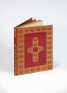 In-folio (273 x 192 mm) de 142 ff.n.ch. Collation: a8 b-g6 h8 i-z6. Dernier feuillet avec le portrait gravé suivi du nom de Jean de Meung; maroquin rouge, plats richement ornés d'une large bordure composée de cases dorées au pointillé, chacune avec une rose mosaïquée, pièce centrale reprenant le décor, dos à nerfs orné dans le même style, roulette intérieure, doublure de maroquin rouge orné d'un semé de roses, tranches gauffrées (Lortic), étui assorti en maroquin rouge.