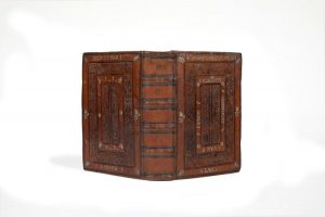 Fort volume in-8 (192 x 135 mm) de 16 ff.n.ch., 655 pp., veau brun sur ais de bois, plats ornés de roulettes à froid (St Pierre, Agnus Dei) et d'un décor argenté avec l'inscription au plat supérieur "Opibus Prestantior Laus" et "Johannes Grimholt van Essen", plat inférieur avec la légende "Tout