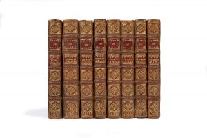 8 volumes in-12 (163 x 90 mm) de 12 ff.n.ch., 309 pp., 1 f.n.ch. de privilège, 4 planches gravées pour le volume I; 419 pp., 5 planches gravées pour le volume II; 310 pp., 1 f.n.ch. de privilège, 5 planches gravées pour le volume III; 298 pp., 1 f.n.ch. de privilège, 3 planches gravées pour le volume IV; 335 pp., 3 planches gravées pour le volume V; 287 pp., 3 planches gravées pour le volume VI; 261 pp., 1 f.n.ch. de privilège, 4 planches gravées pour le volume VII; 312 pp., 3 planches gravées pour le volume VIII; veau moucheté, dos à nerfs orné, pièce de titre en maroquin rouge, tranches jaspées (reliure de l'époque).