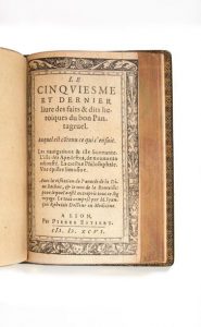 Pantagruel. Avec la prognostication Pantagrueline. - Le cinquiesme et dernier livre des faits & dits héroïques du bon Pantagruel... Avec la Visitations de l'oracle de la Dive Bacbuc, & le mot de la bouteille. Lyon, Pierre Estiart, [Montebéliard, Jacques Foillet] 1596.