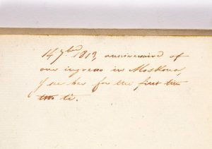 Cette note fait allusion a un exploit intime, que le collectionneur Francois Michel explique dans une lettre inseree dans le volume: ? La date, inscrite deux fois, et que le rappel de l'anniversaire (l'entree a Moscou) rend indiscutable, nous oblige a interpreter les mots “I see her for the first time”, comme signifiant “Je la vois pour la premiere fois, [cette annee] en tete a tete”, ou plus clairement: “Je la b.... pour la 1e fois cette annee” !... On sait, en effet qu'il etait revenu de
