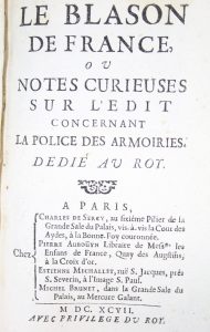 EMBLÈMES & HÉRALDIQUE. - Ensemble 2 ouvrages. - [CADOT (Thibault)]. Le Blason de la France, ou Notes curieuses sur l'édit concernant la police des armoiries. Paris, Charles de Sercy, Pierre Auboüyn, Estienne Michallet, Michel Brunet, 1697. In-8,...
