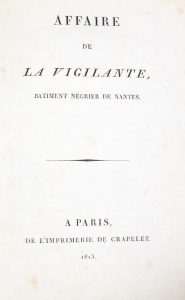 ESCLAVAGE. - AFFAIRE DE LA VIGILANTE, bâtiment négrier de Nantes. Paris, De l'Imprimerie de Crapelet, 1823. In-8, brochure cousue d'un fil, couverture de papier bleu portant le titre à la plume, chemise et étui modernes. Édition originale de ce...