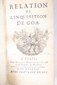tranches dorées sur marbrure (Reliure de l'époque). Caillet, n°7172. - Guaïta, n°1888. - Yve-Plessis, n°1138. Édition originale de cet ouvrage peu commun, mis à l'Index l'année suivante. Exemplaire aux armes de Louis-Charles Voisin de Saint-Paul (vers 1682-1708), conseiller au Parlement de Paris puis président à mortier à Rouen. Coiffes abimées, celle du bas en partie détruite par des vers. Auréoles claires et tache d'encre sur les plats. On joint, sur le même sujet : - [DELLON (Charles)]. Relation de l'Inquisition de Goa. Paris, Daniel Horthemels, 1688. In-12. 5 (sur 6) figures gravées sur cuivre, reliure de l'époque usagée. - [MORELLET (l'abbé)]. Le Manuel des Inquisiteurs, à l'usage des Inquisitions d'Espagne & de Portugal. Lisbonne, 1762. In-12, basane de l'époque, frottée.
