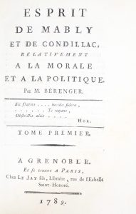 BÉRENGER (Laurent-Pierre). Esprit de Mably et de Condillac, relativement à la morale et à la politique. Grenoble, Et se trouve à Paris, Le Jay fils, 1789. 2 volumes in-8, demi-chagrin bleu nuit, dos lisse orné, tranches mouchetées (Reliure vers...
