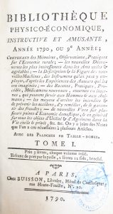 BIBLIOTHÈQUE PHYSICO-ÉCONOMIQUE, instructive et amusante. Contenant des Mémoires, Observations pratiques sur l'Économie rurale, les nouvelles Découvertes, la Description & la Figure des nouvelles Machines, des Instrumens qu'on peut employer...
