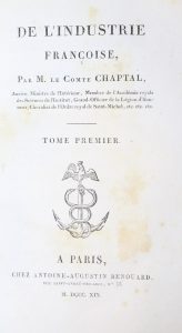 CHAPTAL (Jean-Antoine). De l'industrie françoise. Paris, Imprimerie de Crapelet, Antoine-Augustin Renouard, 1819. 2 volumes in-8, demi-basane blonde avec petits coins, dos lisse orné, pièces de titre et de tomaison rouges, tranches vertes...
