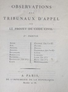 non rogné (Reliure de l'époque). Édition originale. Les premiers titres du projet de code civil rédigé par Tronchet, Portalis, Bigot-Préameneu et Maleville, lequel sera adopté en 1804, avaient été soumis pour examen aux différents tribunaux d'appel du pays et au tribunal de cassation. Sur les 29 cours d'appel de France, seules 27 répondirent, à l'exception de celles d'Ajaccio et de Pau ; on notera la présence des tribunaux de Bruxelles et de Liège, villes faisant à l'époque partie de la République française. Exemplaire tel que paru, broché et non rogné. Quelques piqûres et légères mouillures.