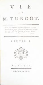 édition de cette biographie et éloge du grand ministre et économiste, publiée pour la première fois en 1786. Selon Spengler, p. 242, si Condorcet n'a apporté qu'une faible contribution à la théorie économique, il fut cependant un excellent vulgarisateur de la doctrine physiocratique, en particulier celles de Turgot. Dans cet ouvrage, la théorie fiscale de Turgot est exprimée en termes mathématiques. Gardes brunies, petite fente à un mors.