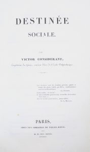 vert, dos lisse orné (Reliure de l'époque). Del Bo, p. 10. - Einaudi, n°1247. - Versins, p. 201. Très rare édition originale de l'ouvrage majeur de Victor Considérant (1808-1893), principal vulgarisateur de la doctrine fouriériste. Elle est ornée d'un frontispice gravé sur bois d'après un dessin de l'auteur, représentant un phalanstère. Il n'y a pas dans toute la riche littérature phalanstérienne un ouvrage de propagande qui puisse soutenir la comparaison avec Destinée sociale. [...] Comme ordre, logique, méthode, clarté, attrait, Destinée sociale répond à tout de ce qu'on peut exiger d'un ouvrage de ce genre (Dommanget, Victor Considérant, p. 17). Victor Considérant, rédacteur en chef de la revue Phalanstère dès 1832, fonda La Phalange en 1836 et devint, à la mort de Fourier survenue un an plus tard, le chef du mouvement phalanstérien. Dans ce livre, il expose et fait une ample publicité de la théorie sociale de Charles Fourier, qu'il considère comme le Christophe Colomb du nouveau monde social (t. I, p. 336). Sa définition de l'économie politique n'est pas surprenante : L'Économie politique, fouillis d'élucubrations plus ou moins nulles, plus ou moins fausses, faites par des docteurs sans génie, qui n'ont jamais rien su voir d'avance, et qui n'ont même pas vu souvent les choses accomplies (t. I, p. 323). Exemplaire complet de tout ce qui a paru, sans mention d'édition et aux bonnes dates. Quelques rousseurs. Petite tache d'encre brune à la pointe angulaire d'une vingtaine de feuillets au tome II. Restauration en queue du tome I. Le tome III est relié à l'imitation, avec la couverture imprimée conservée.