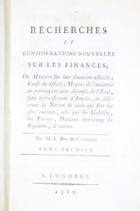 CORMERÉ (Guillaume-François de Mahy, baron de). Recherches et considérations nouvelles sur les finances. Londres, 1789. 2 volumes in-8, demi-basane fauve, dos lisse orné, pièces de titre et de tomaison rouges, tranches jaunes (Reliure de...