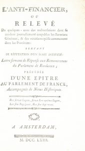 [DARIGAND]. L'Anti-financier, ou Relevé de quelques-unes des malversations dont se rendent journellement coupables les Fermiers Généraux, & des vexations qu'ils commettent dans les Provinces. Amsterdam, 1763. In-8, veau marbré, dos orné, pièce...