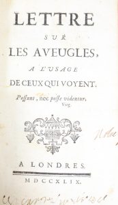 DIDEROT (Denis)]. Lettre sur les aveugles, à l'usage de ceux qui voyent. Londres, 1749. In-12, veau moucheté, filet à froid, dos orné, tranches rouges (Reliure de l'époque). Granier, Bibliographie charitable, n°1034. Édition originale, ornée...