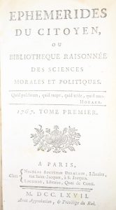 ÉPHÉMÉRIDES DU CITOYEN, ou Bibliothèque raisonnée des sciences morales et politiques. Paris, Nicolas-Augustin Delalain, Lacombe, 1767. 2 tomes en un volume in-12, veau marbré, dos lisse orné, pièce de titre rouge, tranches rouges (Reliure de...