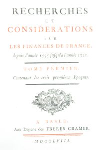 [FORBONNAIS (François Véron de)]. Recherches et considérations sur les finances de France, depuis l'année 1595 jusqu'à l'année 1721. Bâle, Aux dépens des frères Cramer, 1758. 2 volumes in-4, veau marbré, dos orné, tranches rouges (Reliure...