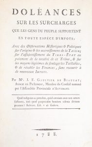 GAULTIER DE BIAUZAT (Jean-François). Doléances sur les surcharges que les gens du peuple supportent en toute espèce d'impôts. S.l.n.n., 1788. In-8, broché, non rogné, couverture muette bleue de l'époque, pièce de titre manuscrite au dos,...