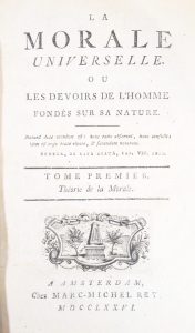 [HOLBACH (baron d')]. La Morale universelle. Ou les devoirs de l'homme fondés sur sa nature. Amsterdam, Marc-Michel Rey, 1776. 3 tomes en un volume in-8, demi-basane marbrée, dos lisse orné, pièce de titre orangée (Reliure de l'époque). INED,...
