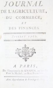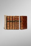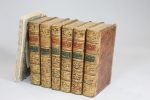 tranches dorées (broché pour un des mensuels) (Reliure de l'époque). Sgard, n°650. Tête de collection de cet important journal économique, berceau de la doctrine des physiocrates. Le Journal de l'agriculture, publié de juillet 1765 à 1783, fut créé comme un supplément à la Gazette du commerce avec l'ambition de constituer le dépôt le plus riche & le plus intéressant sur les matières économiques (t. I, pp. III-IV). Pierre-Samuel Dupont de Nemours en fut le rédacteur en chef jusqu'en novembre 1766, date à laquelle il fut congédié par les propriétaires. Ses amis, Quesnay, Le Trosne et Mirabeau en particulier, jusqu'alors collaborateurs réguliers de la revue, furent aussi écartés. Tous se tournèrent alors vers l'abbé Baudeau qui les accueillit de manière favorable dans les Éphémérides du citoyen, son propre journal qui deviendra dès janvier 1767 le nouvel organe de propagande des physiocrates. Quant au Journal de l'agriculture, celui-ci se montrera désormais nettement hostile aux économistes. Les mensuels de ces deux années, juillet 1765 à novembre 1766, sont donc des publications capitales dans l'histoire de l'école physiocratique. On y trouve notamment plusieurs articles de Quesnay en édition originale, dont la liste est dressée dans François Quesnay, INED, pp. 309 et suivantes. Les sujets principalement traités dans cette revue sont liés aux questions du prix des grains, de la libre concurrence du commerce, des colonies, etc. Signalons un intéressant mémoire sur l'art de faire le vin rouge (t. II) et un autre sur le dépeuplement des rivières de la Loire (t. V). 3 planches dépliantes dans le tome V, représentant une charrue, un semoir et une machine pour élever des fardeaux. Bel ensemble, joliment relié et provenant de la bibliothèque du marquis d'Aligre (1770-1847) (ex-libris), futur conseiller général de la Seine, chambellan de la princesse Caroline, épouse de Murat, puis pair de France. Manquent les deux premières parties du tome VI (septembre 1766), la troisième étant ici jointe brochée, telle que parue à l'époque sous couverture de papier marbré. Déchirure de papier sans manque au feuillet F12 de la deuxième partie du tome II. Salissures au cahier D du tome IV (février 1766). Petit manque à l'extrémité de la planche de la charrue, avec numéro de pagination supprimé.