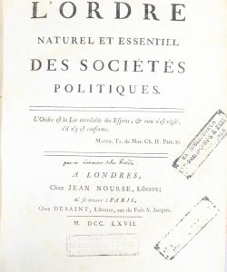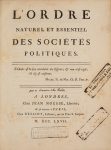 n°2794 (pour l'édition in-12 parue la même année). - Schumpeter, p. 225. - Spengler, pp. 184-186. Édition originale au format in-4. Le meilleur compte-rendu de la doctrine physiocratique, selon Adam Smith. L'auteur développe les conceptions politiques de l'école physiocratique, dont il fut le principal codificateur. Il explique que le despotime légal(contrairement au despotisme arbitraire) est la forme nécessaire au bonheur des sociétés ; le souverain doit alors se plier aux lois naturelles supérieures qui reposent sur les principes de propriété, de liberté et de sûreté : si ces Princes infortunés eussent eu une connaissance évidente de l'ordre naturel & essentiel des sociétés, ils auroient trouvé dans son despotisme légal, la véritable indépendance, le véritable despotisme personnel qui faisoit l'objet de leur ambition ; par son moyen, ils seraient parvenus naturellement & rapidement au dernier degré possible de richesses, de puissance, de gloire & d'autorité (pp. 178-179). Tampons humides répétés sur le titre dans la marge de la p. 41 : Ex Bibliotheca FF. Praed. Conv. S.M. Magd. Apud. S. Maximinum. Quelques légères rousseurs. Restaurations à la reliure (coins, coiffes et charnières).